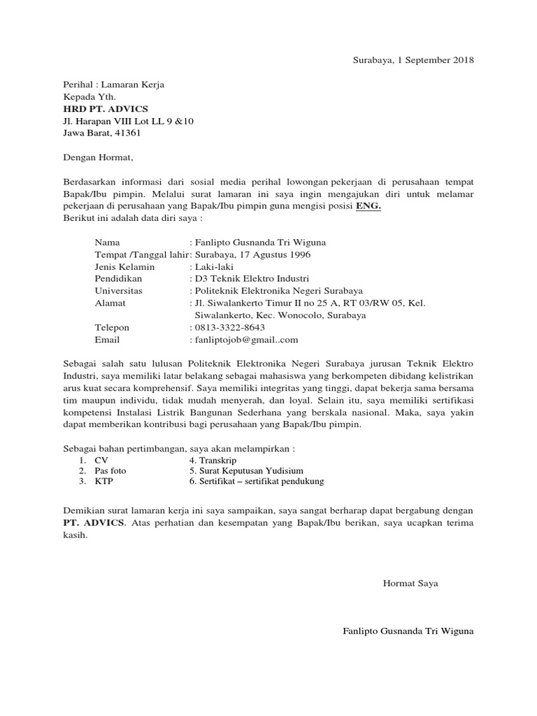 Ketika kamu melamar kerja sebagai karyawan di suatu pt atau kantor tertentu, tentu kamu harus melakukan hal penting dalam membuat surat lamaran kerjanya. Apalagi jika mendapatkan pekerjaan di perusahaan bergensi dengan skala nasional atau international. Maka tidak heran ketika banyak orang membidik perusahaan dengan status pt (perseroan terbatas). Baik mereka yang baru lulus kuliah s1 atapun mereka yang lulus sma atau smk, tidak hanya mereka yang fresh graduate yang membutuhkan surat lamaran kerja, mereka yang ingin pindah kerja juga membutuhkan surat lamaran kerja untuk tempat pekerjaan. Untuk bahan pertimbangan bagi bapak/ibu pimpinan, sudah saya lampirkan beberapa berkas penting yang dapat mendukung surat lamaran kerja saya.